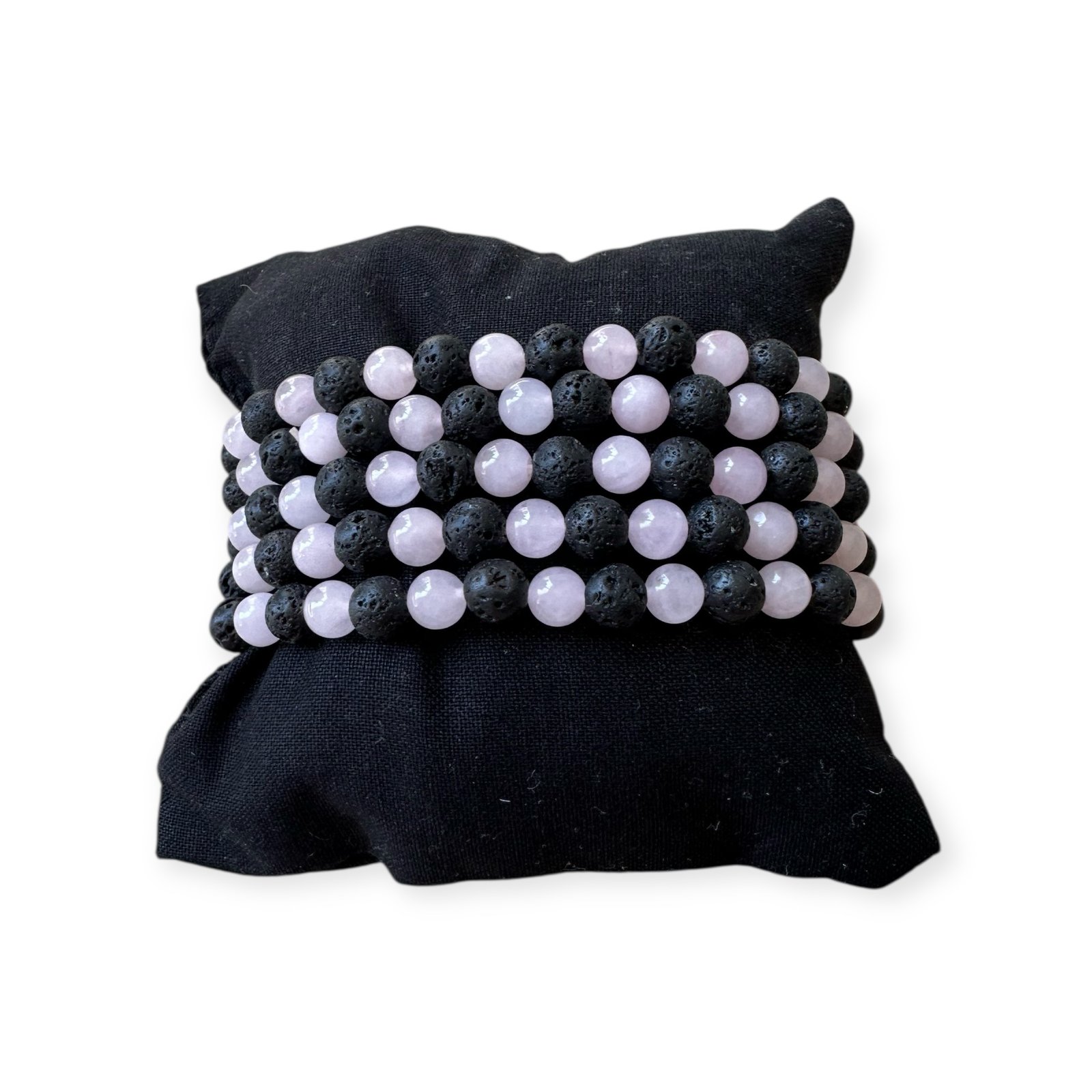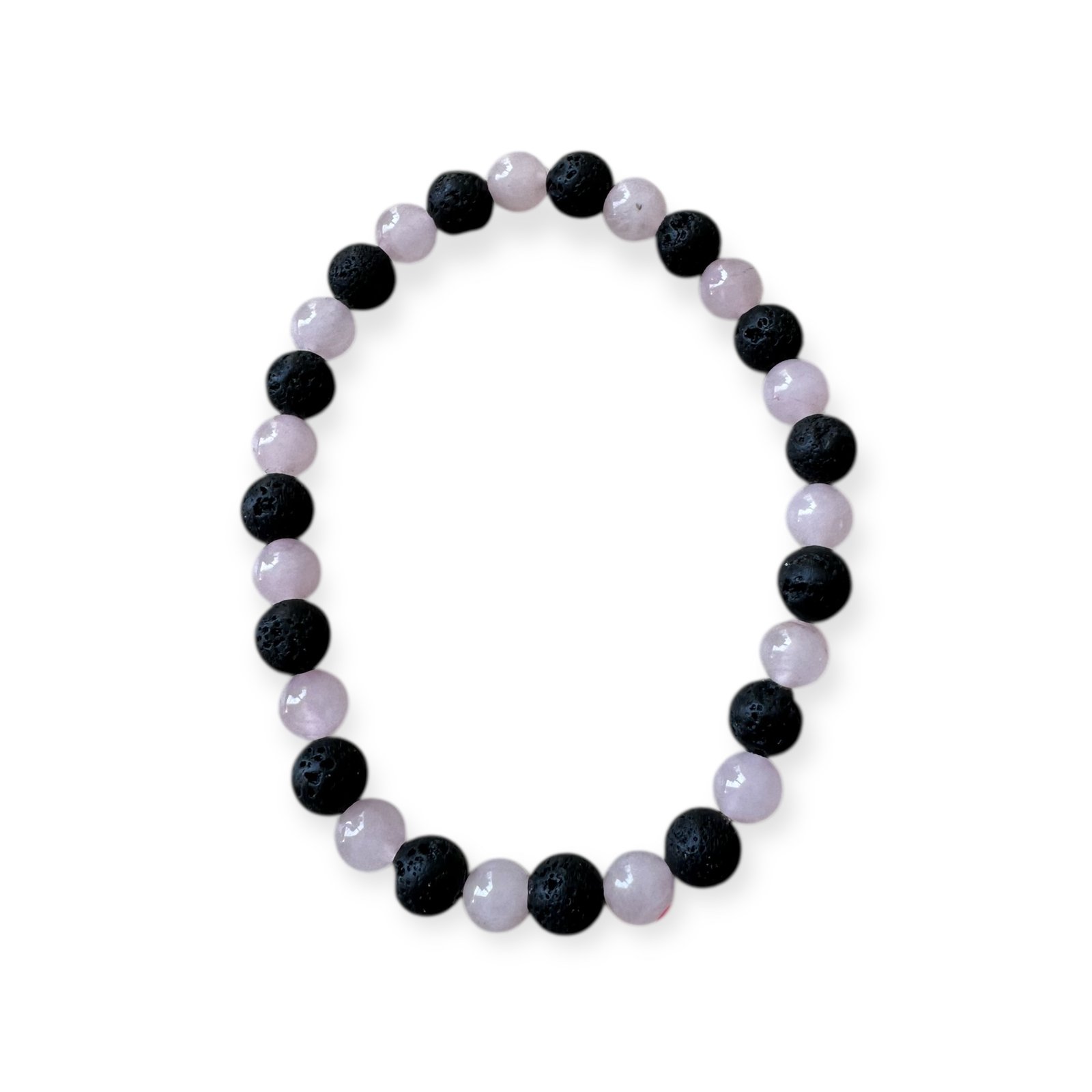 Bracelet en Quartz rose et Pierre de lave (6 mm). Équilibre entre douceur et ancrage. Pour apaiser les émotions et renforcer la stabilité intérieure.