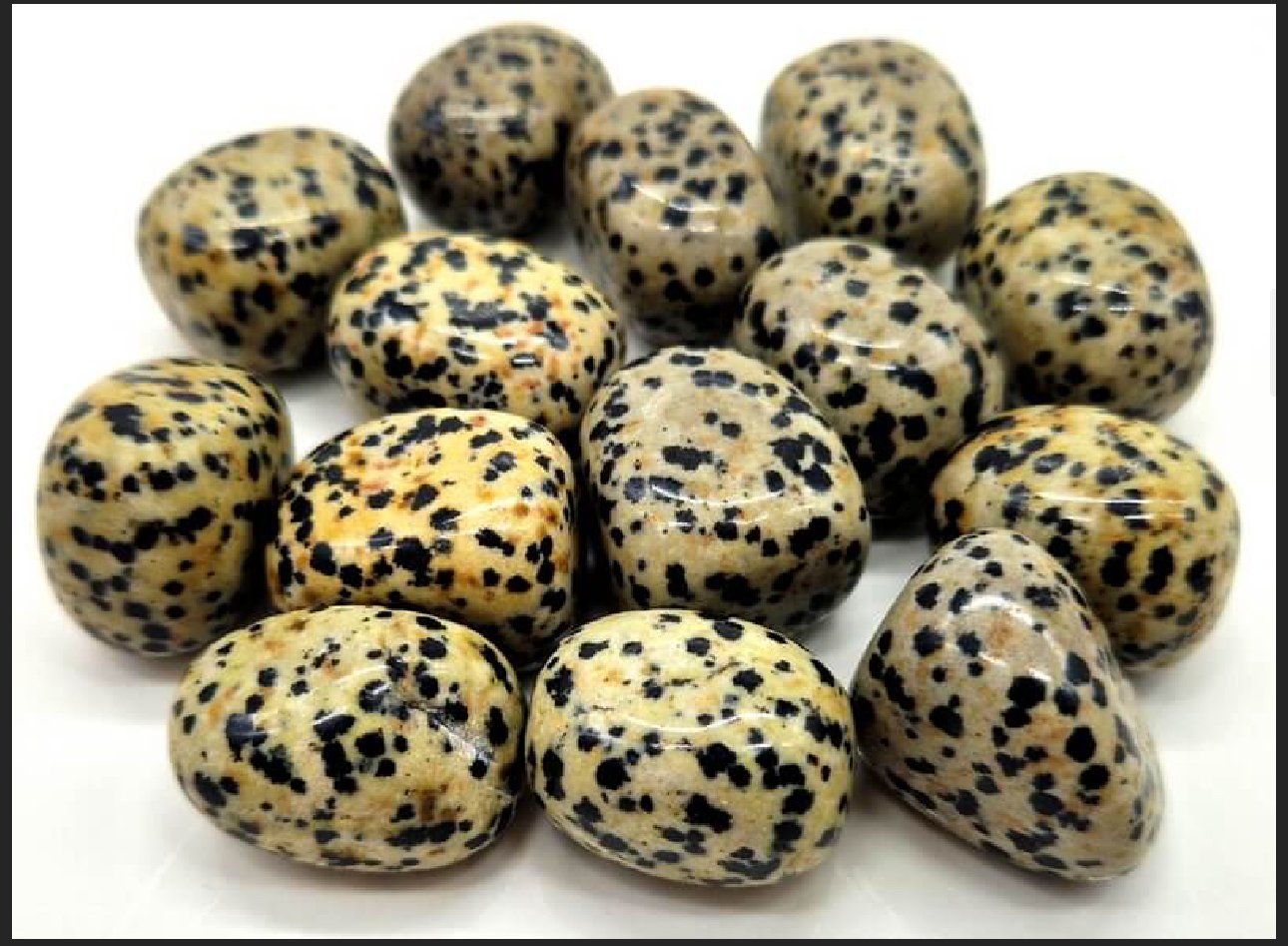 Jaspe Dalmatien A roulé, pierre naturelle vendue à l’unité. Favorise la protection, la joie et la confiance. Première commande accompagnée d’un cadeau surprise.