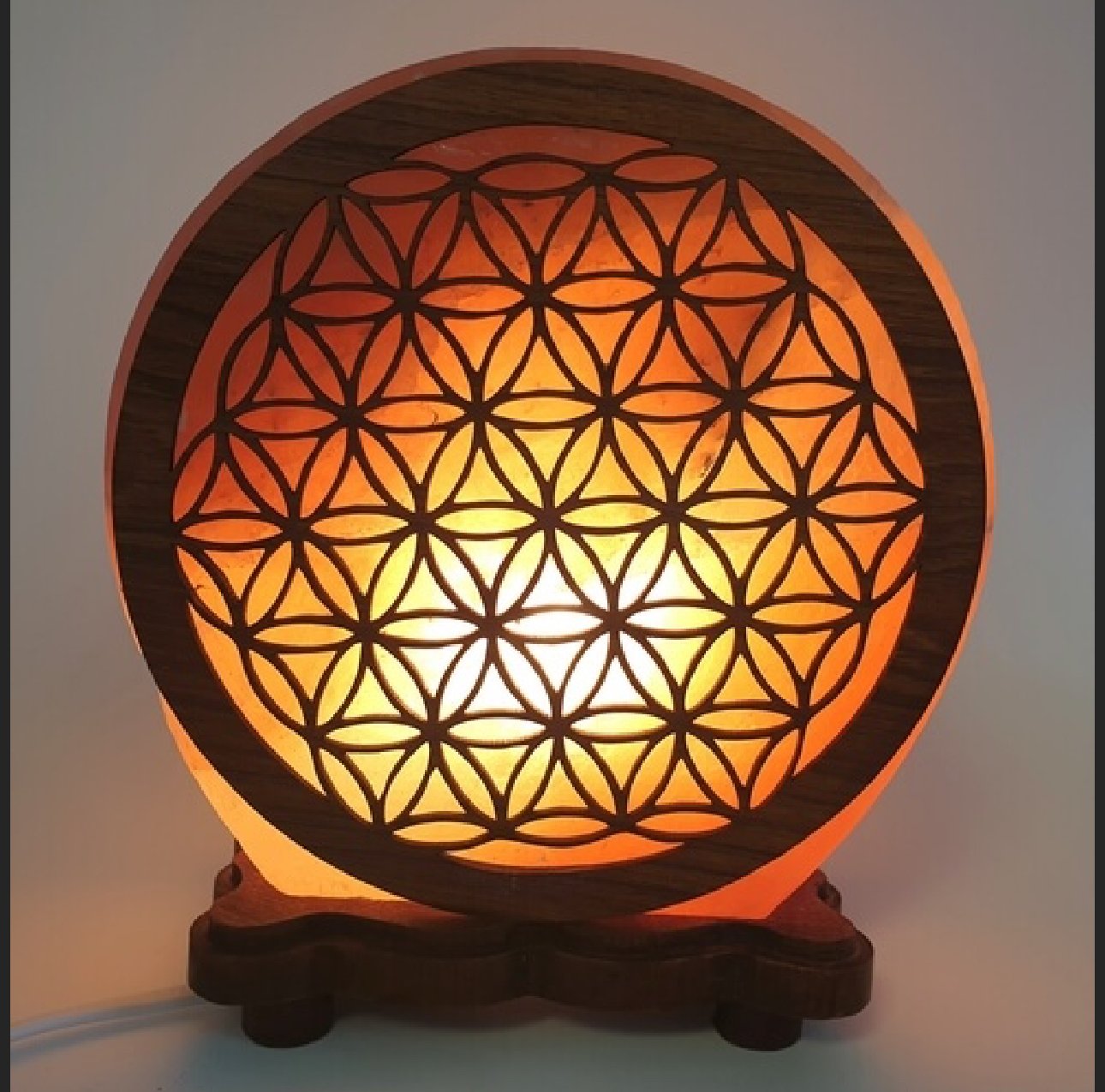 Lampe en sel de l’Himalaya gravée Fleur de Vie. Vendue à l’unité. Purifie l’air, équilibre les énergies et diffuse une lumière apaisante. Fabrication artisanale et sel brut authentique.