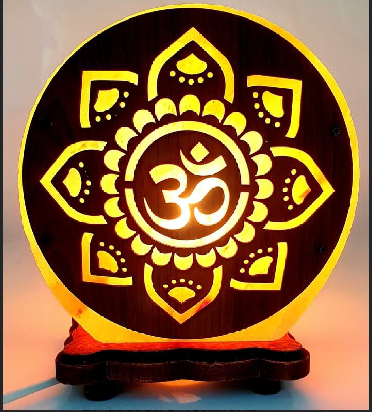 Lampe en sel de l’Himalaya Mandala Om, vendue à l’unité. Purifie l’air et diffuse une lumière douce propice à la détente et à la méditation.