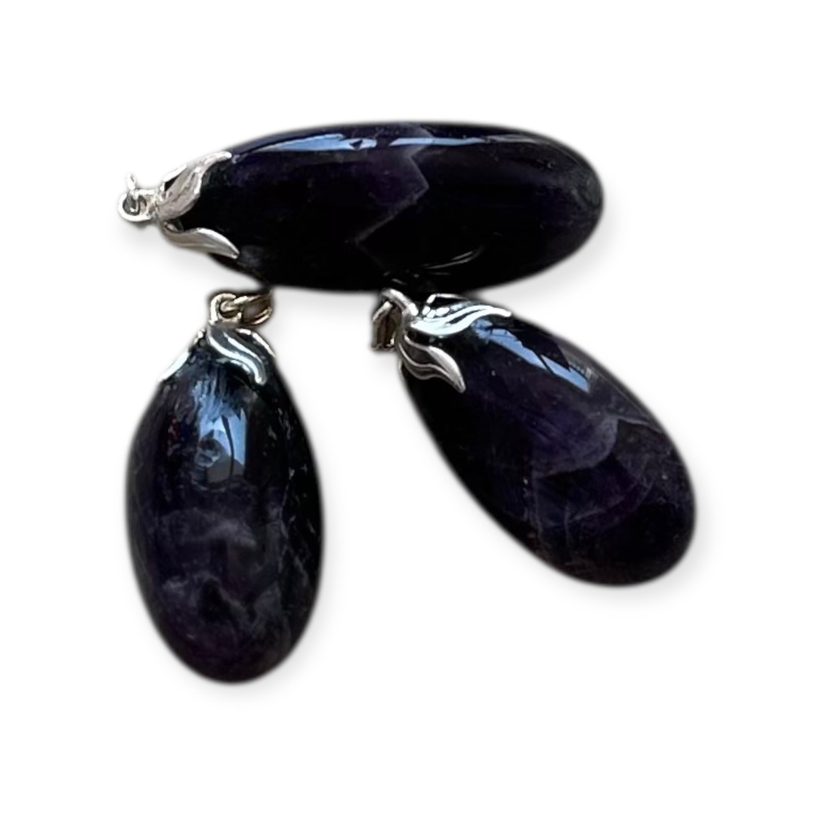 Pendentif en améthyste foncée naturelle. Favorise la sérénité, protège des énergies lourdes et développe l’intuition.
